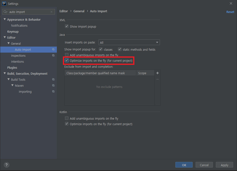 Optimize imports on the fly (for current project) 체크