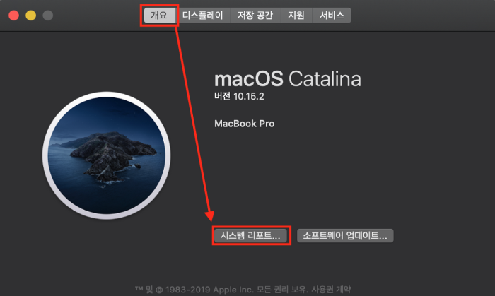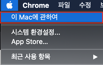 상단 왼쪽의 애플 로고 클릭 -> 이 Mac에 관하여 클릭