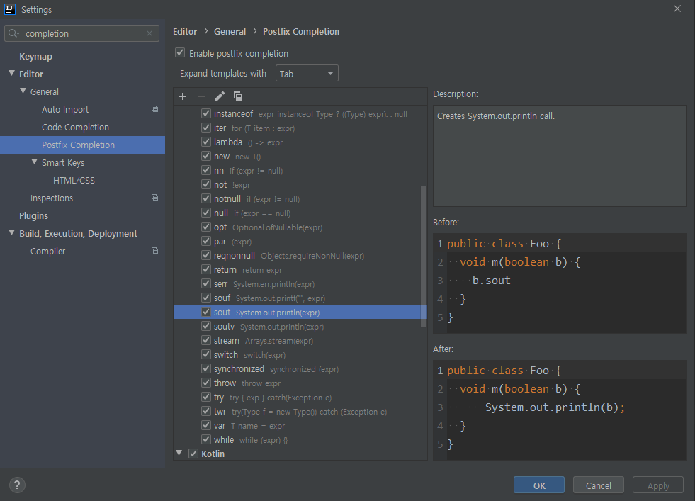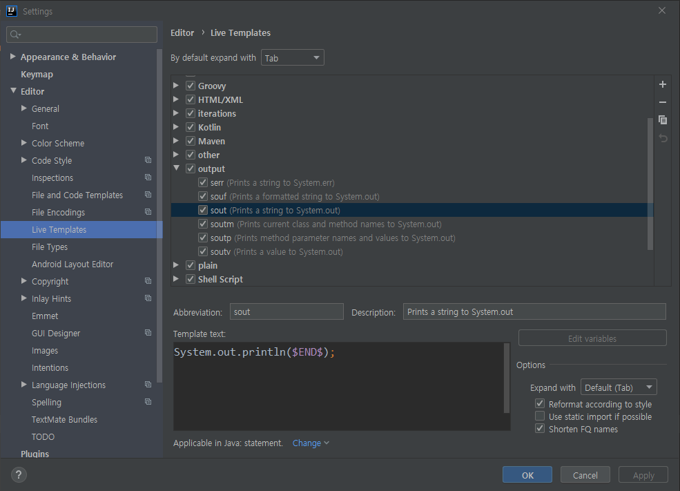 예를 들어 System.out.println(); 을 sout + tab 의 입력으로 빠르게 입력할 수 있다.